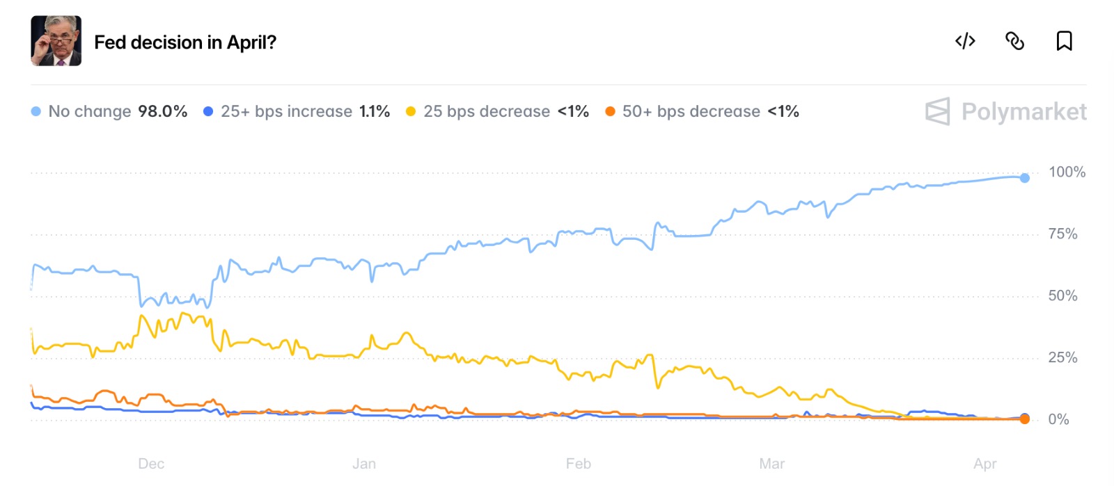 Meanwhile, there is reduced confidence in near-term Fed rate cut decisions. As per Polymarket data, traders expect a 1% chance of a cut at the April meeting. Expectations rise slightly to 10% in June and 22% in July.