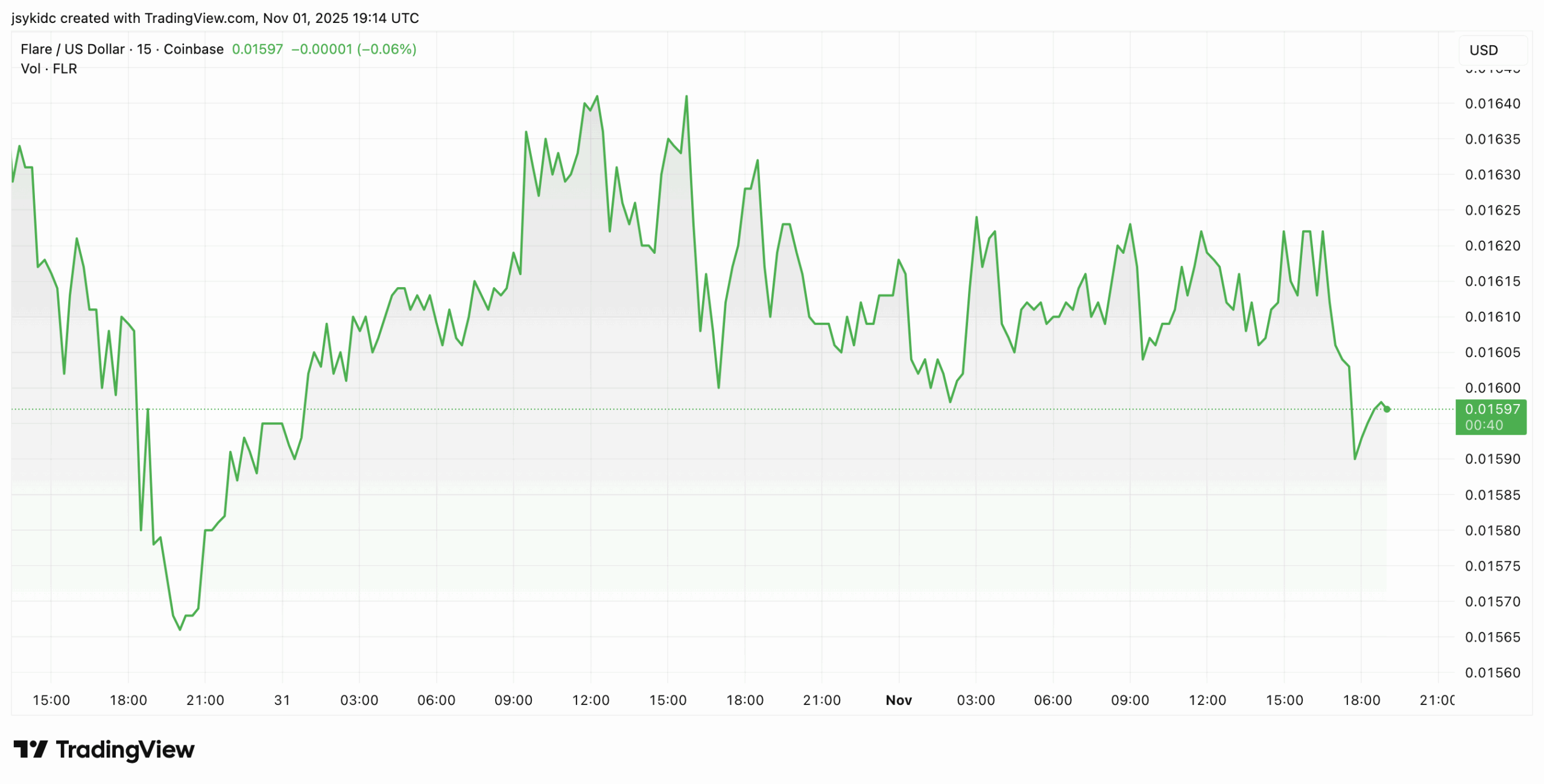 FLR has had trouble keeping up its upward momentum in spite of the adoption. Over the past month, the token has dropped by almost 38% to about $0.016, even though the overall FXRP usage in DeFi has risen above 60%.
