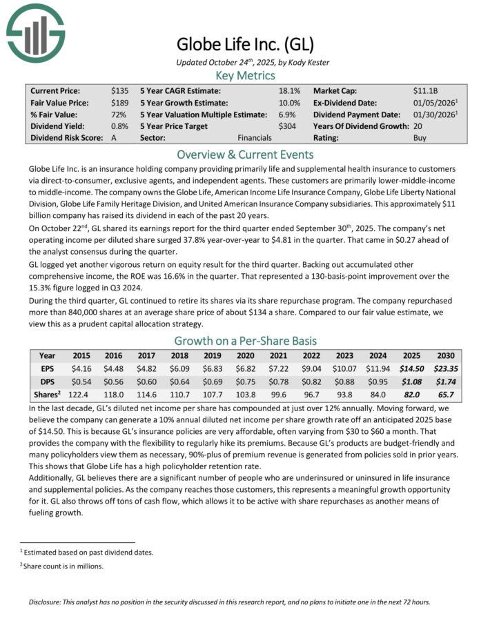 Globe Life is an insurance holding company providing primarily life and supplemental health insurance via direct to consumer, exclusive agents, and independent agents. Founded in 1979, Globe Life has raised its dividend every year for the past 20 years.