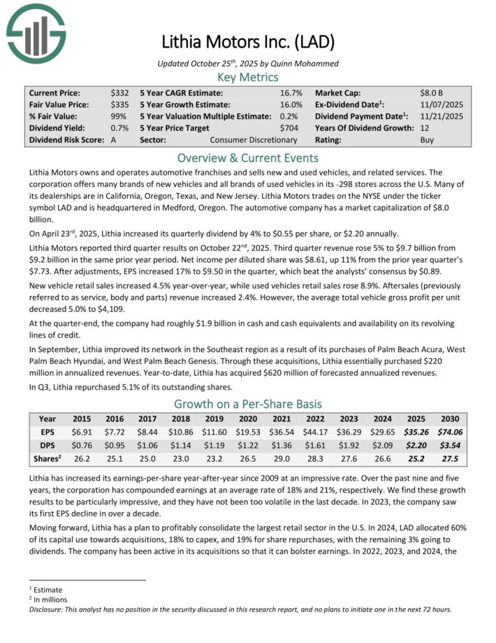 Lithia Motors reported third quarter results on October 22nd, 2025. Third quarter revenue rose 5% to $9.7 billion from $9.2 billion in the same prior year period.