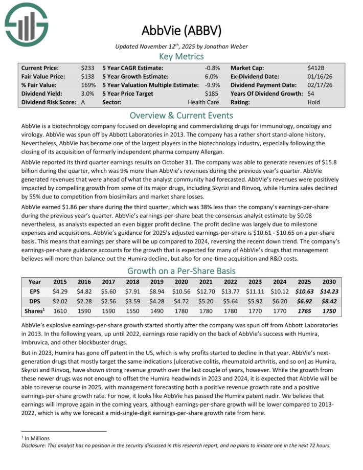 On October 31st, 2025, AbbVie announced that it was raising its quarterly dividend 5.5% to $1.73 per share.