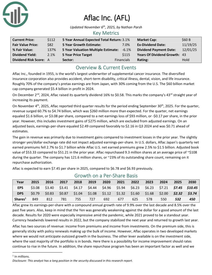 On November 11th, 2025, Aflac announced that it was raising its quarterly dividend by 5.2%, increasing the company’s dividend growth streak to 44 years.