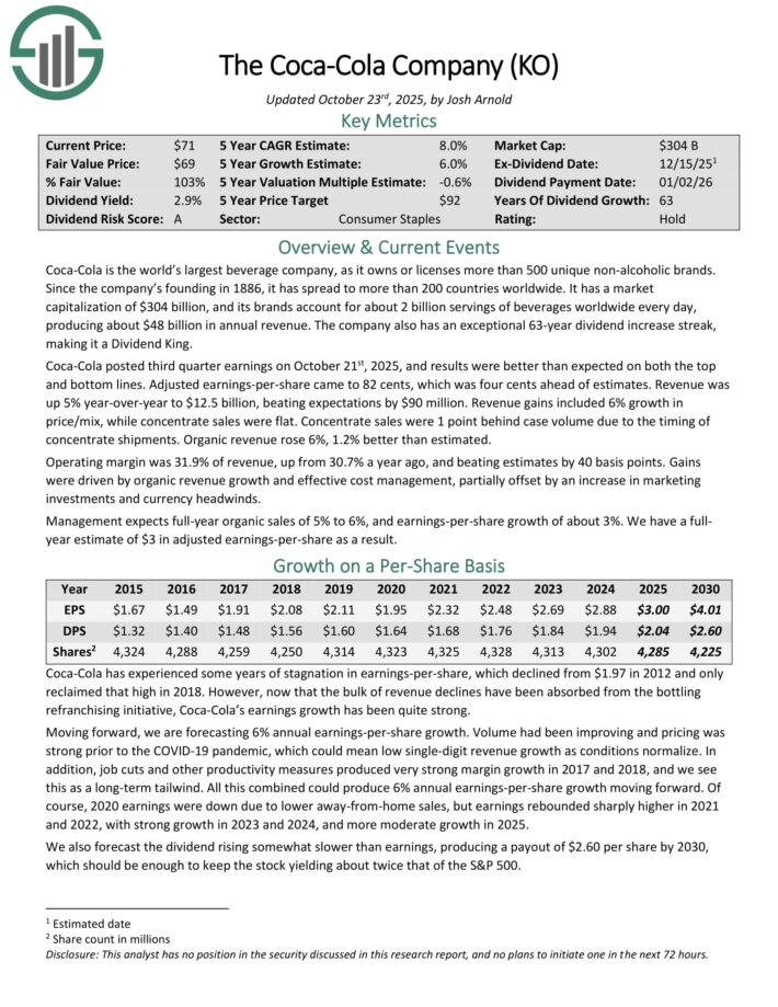 Coca-Cola released third-quarter earnings results on October 21st, 2025, with results that were above estimates on both the top and bottom lines. Adjusted earnings-per-share of $0.82 was $0.04 better than expected while revenue of $12.5 billion was $90 million more than anticipated.