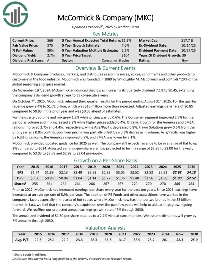 Click here to download our most recent Sure Analysis report on MKC (preview of page 1 of 3 shown below):