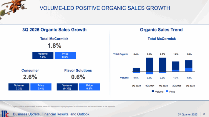 Flavor Solutions grew 0.6% from the prior year as a 0.9% contribution from pricing was partially offset by a 0.3% decrease in volume. Asia/Pacific was higher by 6.3% organically, the Americas improved 0.9%, and EMEA was lower by 3.1%.