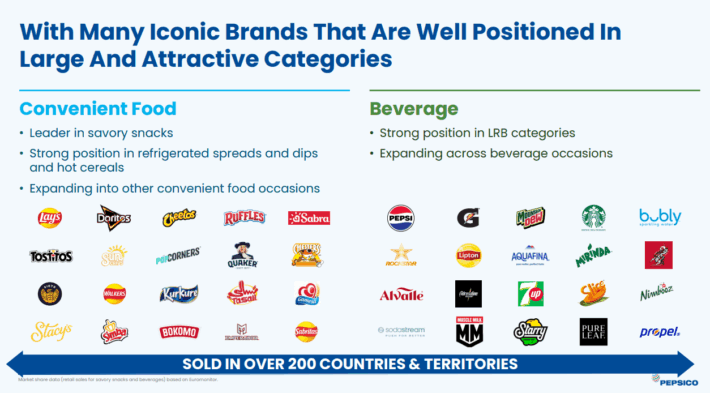 This includes leading brands such as Pepsi, Mountain Dew, Frito-Lay chips, Gatorade, Tropicana, and Quaker foods. The company has more than 20 $1 billion brands.