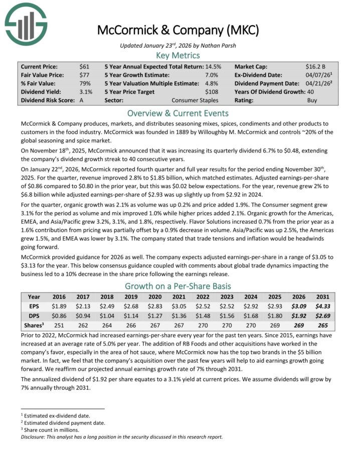 On November 18th, 2025, McCormick announced that it was increasing its quarterly dividend 6.7% to $0.48, extending the company’s dividend growth streak to 40 consecutive years.