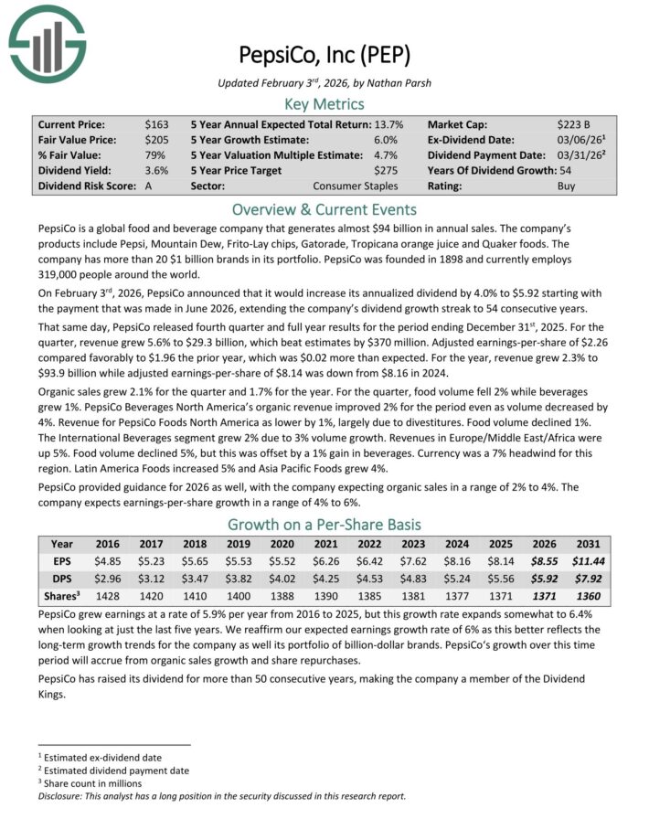 That same day, PepsiCo released fourth quarter and full year results for the period ending December 31st, 2025. For the quarter, revenue grew 5.6% to $29.3 billion, which beat estimates by $370 million.