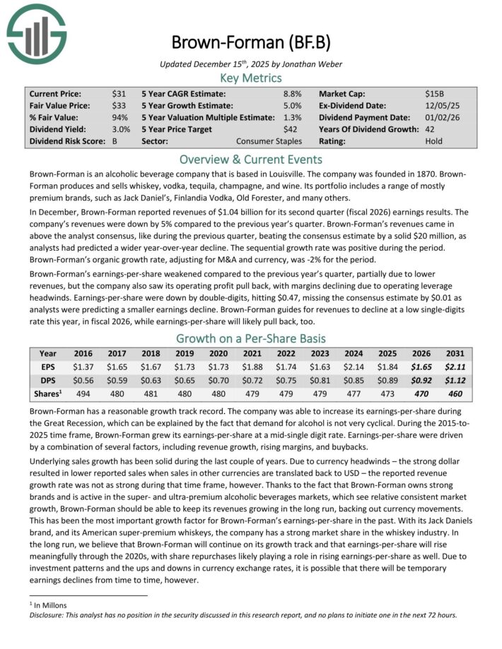 Earnings-per-share were down by double-digits at $0.47, missing the consensus estimate by $0.01. Brown-Forman guides for revenues to decline at a low single-digit rate in fiscal 2026.