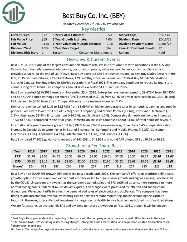 Best Buy reported Q3 FY2026 results on November 25th, 2025. Enterprise revenue increased to $9,672M from $9,445M, and non-GAAP diluted earnings per share (“EPS”) increased to $1.40 from $1.26 on a year-over-year basis. GAAP diluted EPS declined to $0.66 from $1.26. Comparable enterprise revenue increased 2.7%.