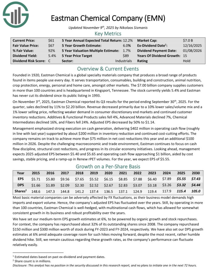 On December 4th, 2025, Eastman Chemical raised its quarterly dividend 1.2% to $0.84 per share, which gives the company a dividend growth streak of 16 years.