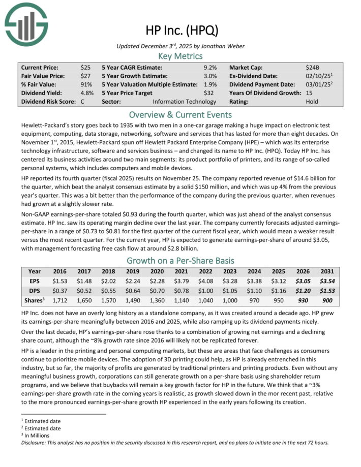 On November 26th, 2025, HP announced that it was raising its quarterly dividend 3.7% to $0.30 per share, extending the company dividend growth streak to 15 years.