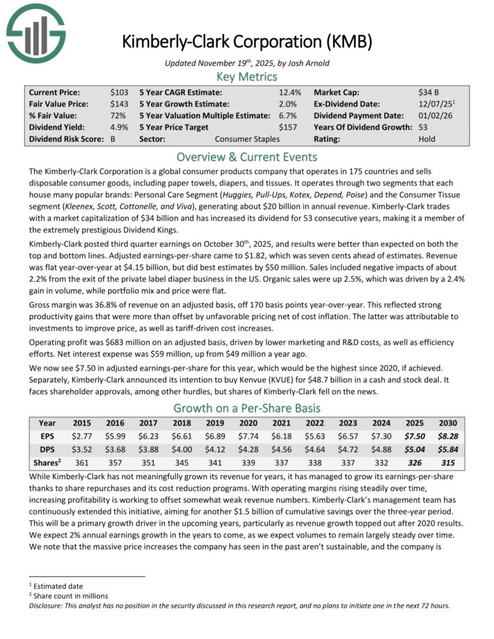 Kimberly-Clark posted third quarter earnings on October 30th, 2025, and results were better than expected on both the top and bottom lines. Adjusted earnings-per-share came to $1.82, which was seven cents ahead of estimates.