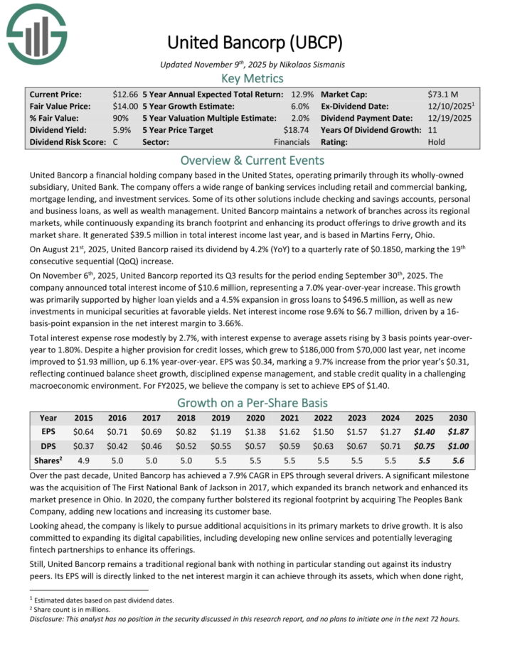 On August 21st, 2025, United Bancorp raised its dividend by 4.2% (YoY) to a quarterly rate of $0.1850, marking the 19th consecutive sequential (QoQ) increase.