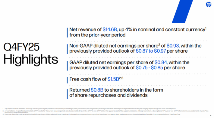 HP reported its fourth quarter (fiscal 2025) results on November 25th, 2025.
