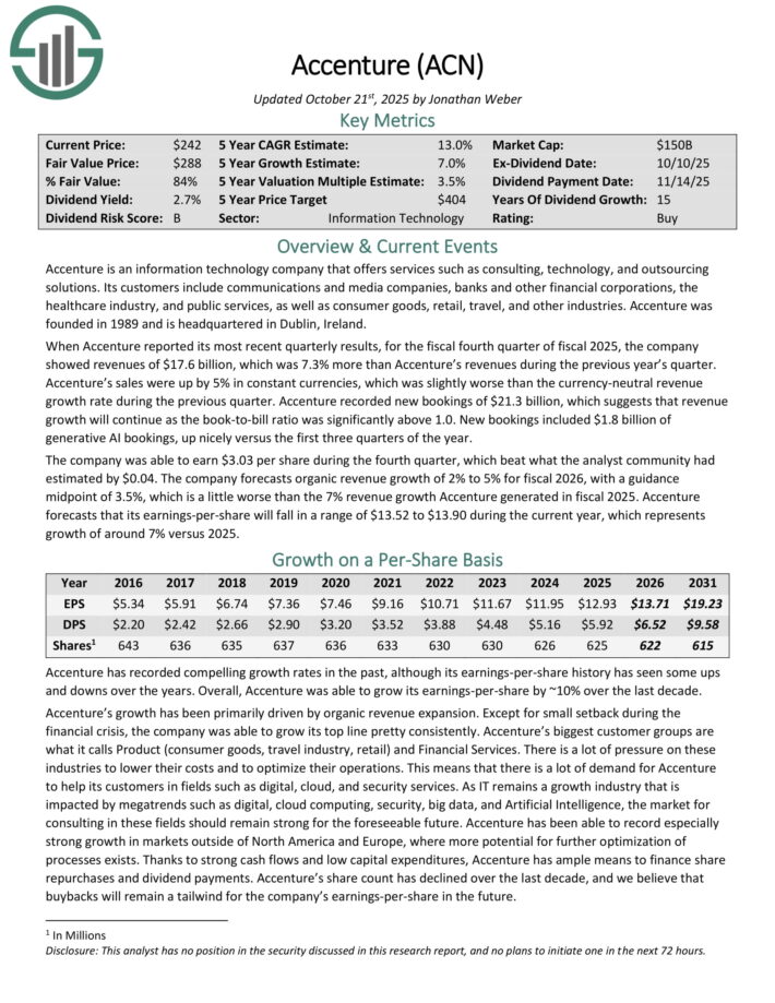 Accenture forecasts that its earnings-per-share will fall in a range of $13.52 to $13.90 during the current year, which represents growth of around 7% versus 2025.