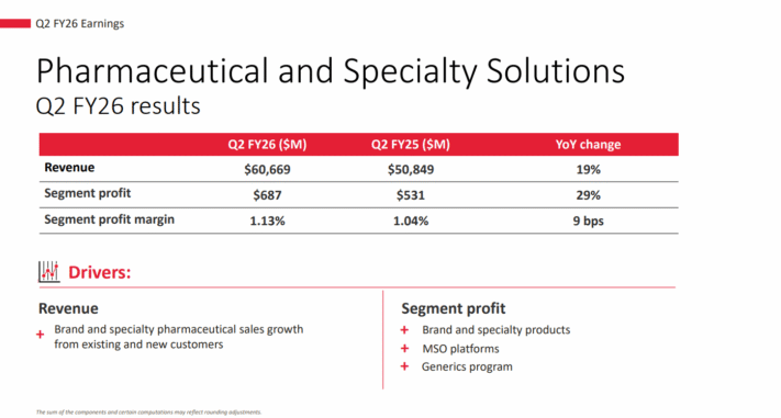 Acquisitions greatly aided results during the quarter. For the period, Pharmaceutical and Specialty Solutions sales grew 19% to $60.7 billion, while segment profit increased 29% to $687 million. Growth continues to be driven by gains in brand and specialty pharmaceutical products from existing and new customers.