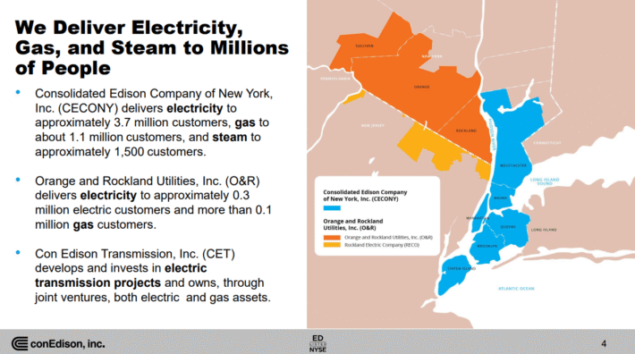 Consolidated Edison is a large-cap utility stock. The company generates nearly $17 billion in annual revenue. The company serves almost 4 million electric customers, and another 1.1 million gas customers, in New York.