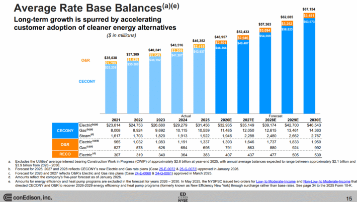 As with prior quarters, higher rate bases for gas and electric customers were the primary contributors to results in the CECONY business, which accounts for the vast majority of the company’s assets. Average rate base balances are expected to grow by 8.6% annually through 2030 off of 2026 levels. This is up from the company’s prior forecast for growth of 8.2%.