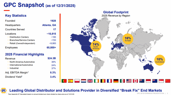 Genuine Parts posted fourth-quarter and full-year earnings on February 17th, 2026. The company reported steady growth in 2025, with fourth-quarter sales rising 4.1% to $6.0 billion and full-year sales increasing 3.5% to $24.3 billion.