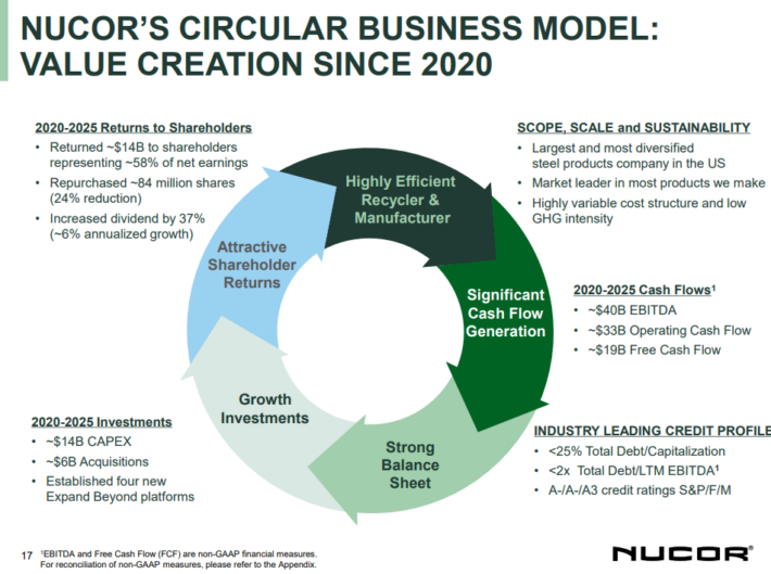 Nucor continued its commitment to shareholder returns, repurchasing 5.4 million shares in 2025 and issuing its 211th consecutive quarterly dividend. The company has increased its dividend for 53 consecutive years.