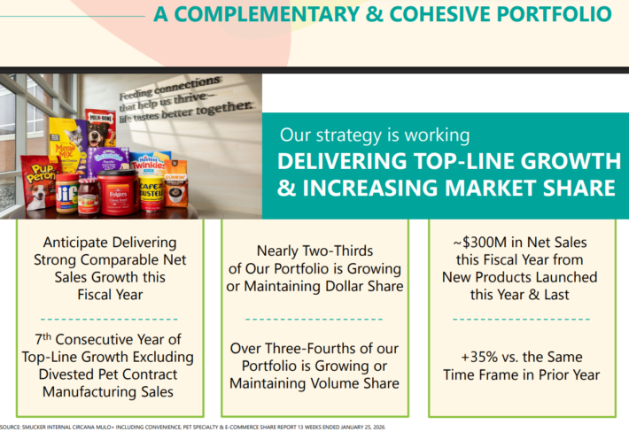 On February 26th, 2026, Smucker’s reported financial results for the third quarter of fiscal 2026, which ends on April 30th, 2026. Currency-neutral, organic sales grew 8% over Q3 2025, thanks to strong demand for the leading brands of the company. Adjusted earnings-per-share declined -9%, from $2.62 to $2.38, but beat analysts’ estimates by $0.12. The company has been very consistent in recent years, with Smucker missing analysts’ consensus only once in the last 26 quarters.