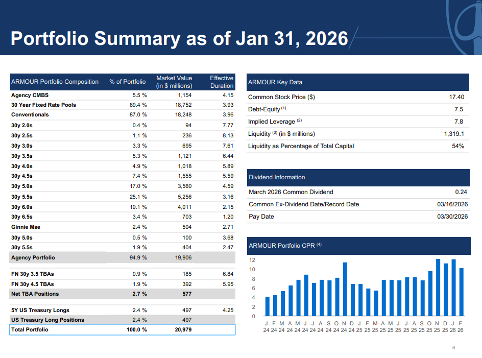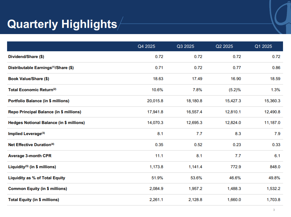 Armour posted fourth quarter and full-year earnings on February 18th, 2026, and results were challenged. Distributable earnings-per-share fell 9% year-over-year for the quarter, missing estimates. The decline was primarily attributable to a much higher share count, as well as much higher repayment rates. The share count nearly doubled in 2025, creating a massive headwind to earnings-per-share. Repayment rates also jumped from 8.7% in Q4 2024 to 11.1% in the most recent quarter.