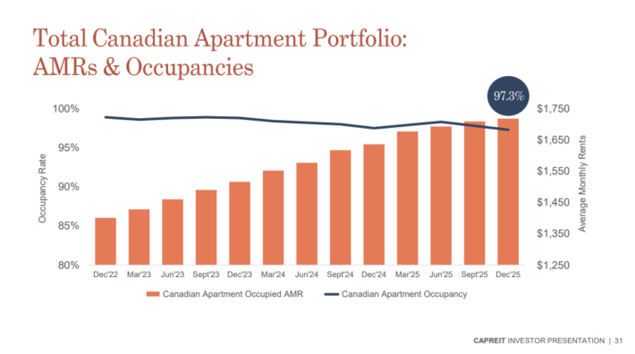 The company’s Canadian portfolio enjoys exceptionally high occupancy, ending the fourth-quarter of 2025 with a 97.3%occupancy rate. CAPREIT remaining suites are in the Netherlands. These were 90.6% occupied to close out the year.