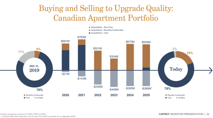 In 2025, the company strategically disposed of $1.2 billion CAD of properties in Canada and the Netherlands. These deals were completed at prices at or above previously reported IFRS fair values at the time of negotiation. The proceeds from these dispositions are being used to acquire recently constructed mid-market rental properties at prices that are meaningfully below replacement cost, as well as unit repurchases.
