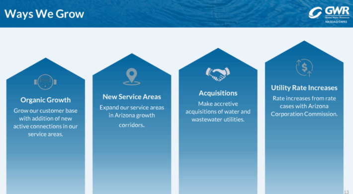 We expect organic growth contributions from rate increases, which amounts to another low single-digit gain annually, on average. Like other utilities, Global Water is able to pass through approved pricing increases to its customers, which is a steady, long-term tailwind to revenue.